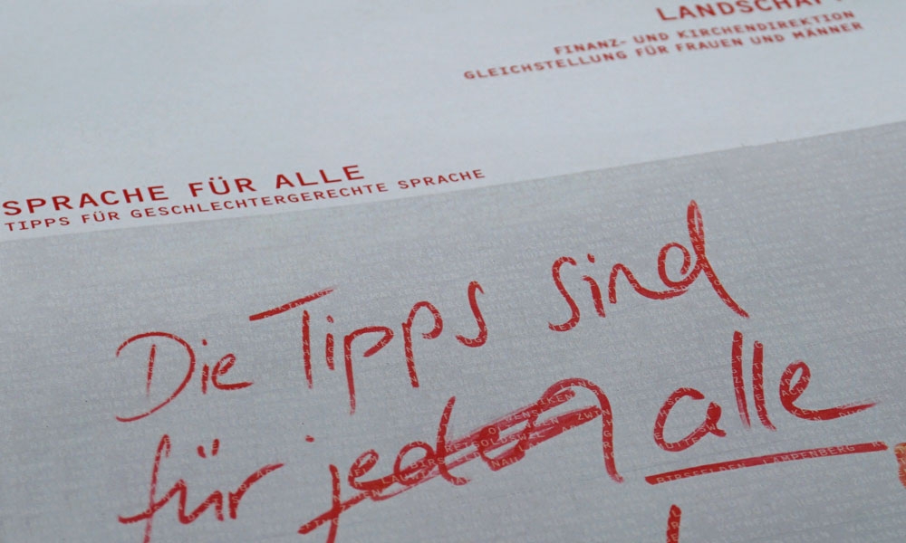 Heisst es Lehrer und Lehrerinnen, Lehrer*innen, Lehrer/innen oder sind sowieso alle mitgemeint? Die Fachstelle für Gleichstellung von Frauen und Männern Baselland will aufzeigen, wie Sprache mit einfachen Mitteln alle Menschen sichtbar machen kann. Dafür haben wir einen Leitfaden mit zehn praktischen Tipps zusammengestellt. Meist geht es nicht um richtig oder falsch, sondern um ein Bewusstsein für die Sprache. Weil niemand nur «mitgemeint» werden will. Den Sprachleitfaden gibt es zum Download.